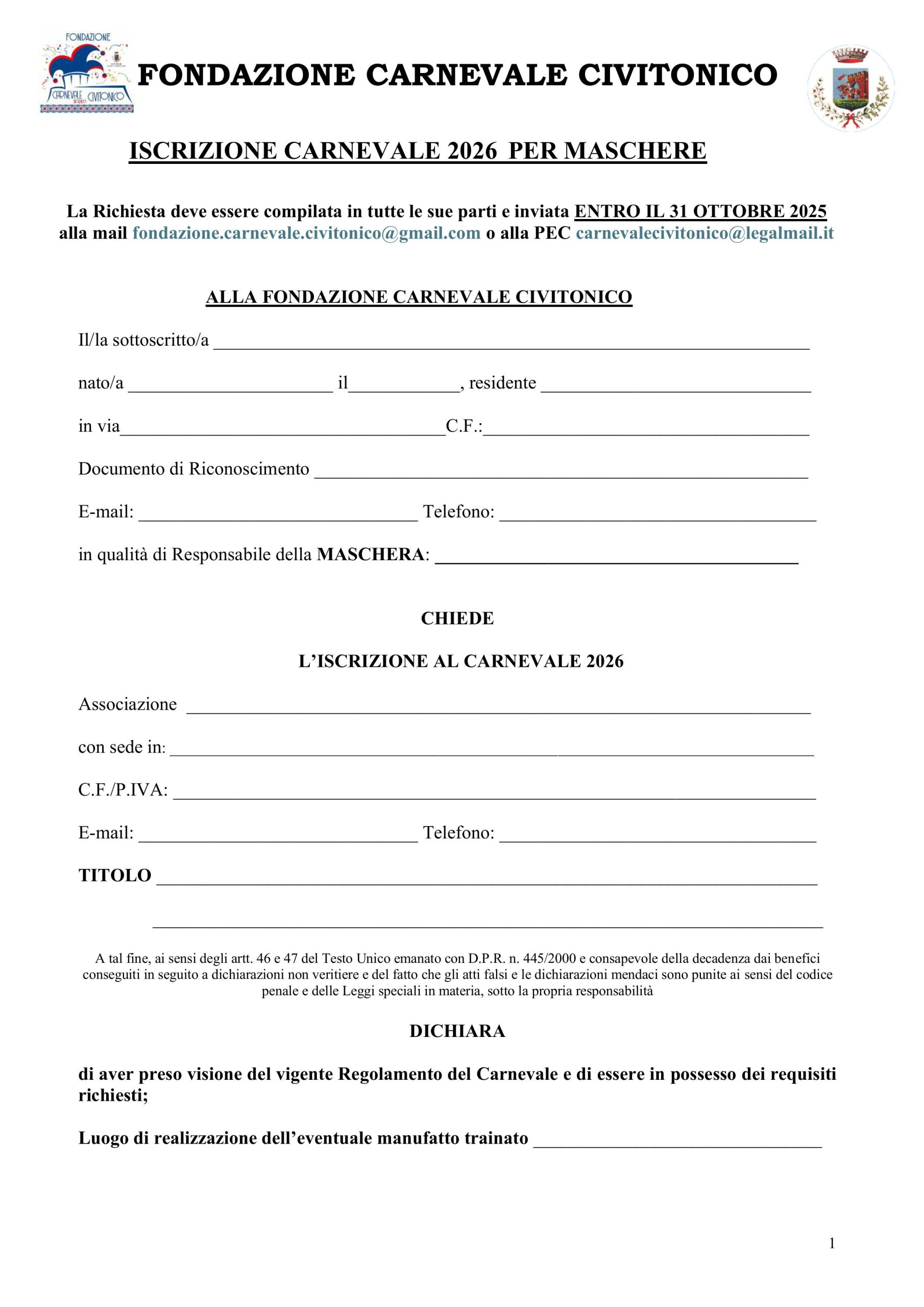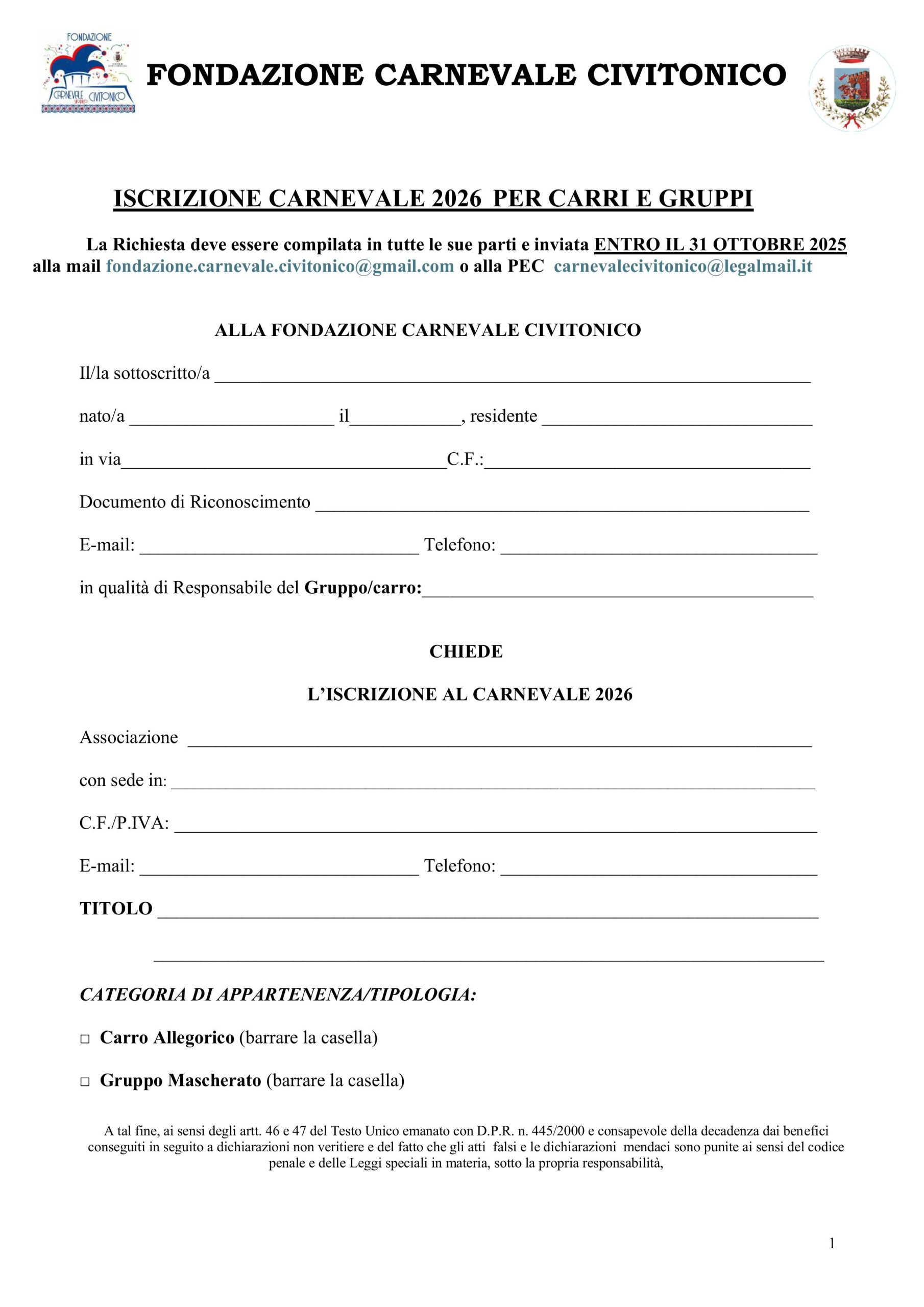 Moduli di iscrizione riservati a Maschere Libere, Gruppi e Carri allegorici.